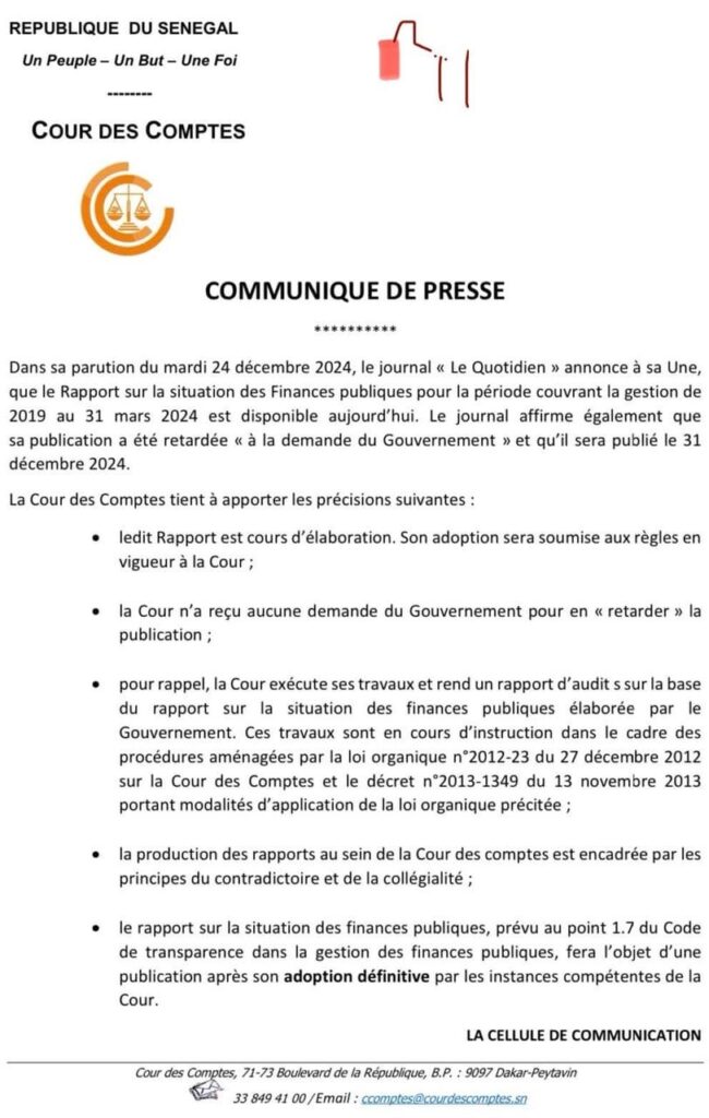 La Cour des comptes affirme n’avoir reçu aucune demande du Gouvernement pour retarder la publication de son rapport sur la situation des Finances publiques couvrant la période 2019-2024