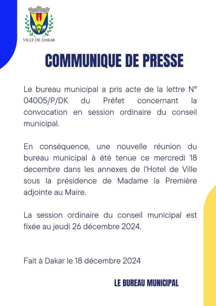 La réunion du Conseil municipal de Dakar prévue ce jeudi a été reportée au 26 décembre, suite à une décision du bureau en concertation avec le préfet.