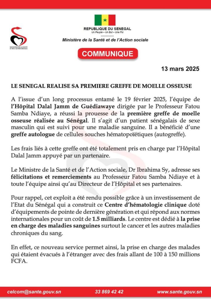 Le ministère de la Santé annonce que l’équipe de l’hôpital Dalal Diam de Guédiawaye, dirigée par le Pr Fatou Samba Ndiaye, a réalisé avec succès la première greffe de moelle osseuse du pays. Une avancée majeure pour la médecine sénégalaise…👇🏿